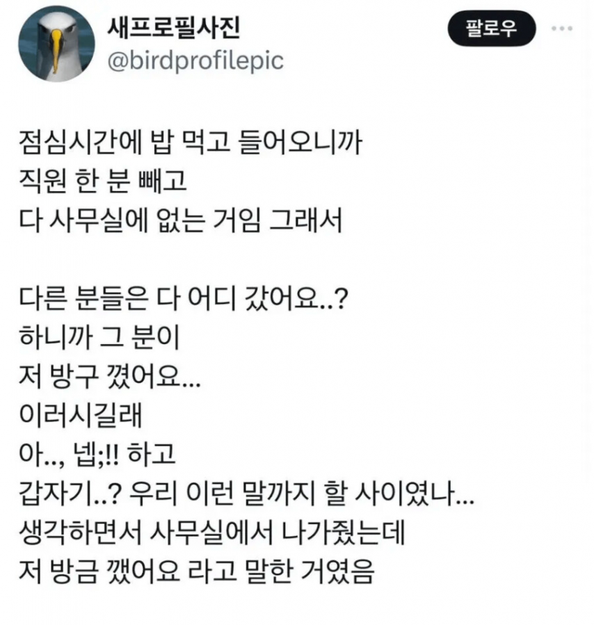방구로 사무실 사람 내보낸 직원 1 3월 2026 • 1 min read • comment Subscribe to 호잇짜응의 시간 죽이기 Get the latest posts delivered right to your inbox Subscribe Great! Check your inbox and click the link to confirm your subscription. Please enter a valid email address!