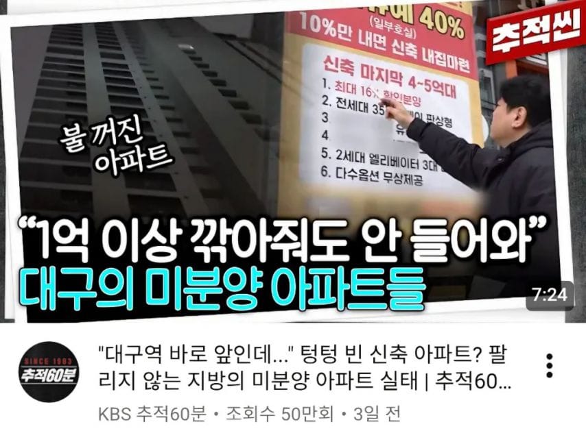 대구역 앞 1억 이상 깍아도 안팔린 미분양 아파트.jpg 22 3월 2026 • 1 min read • comment Subscribe to 호잇짜응의 시간 죽이기 Get the latest posts delivered right to your inbox Subscribe Great! Check your inbox and click the link to confirm your subscription. Please enter a valid email address!