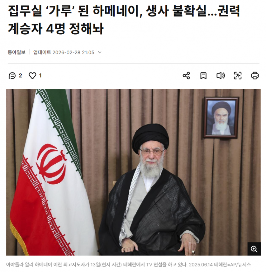 집무실 ‘가루’ 된 하메네이, 생사 불확실…권력 계승자 4명 정해놔 1 3월 2026 • 1 min read • comment Subscribe to 호잇짜응의 시간 죽이기 Get the latest posts delivered right to your inbox Subscribe Great! Check your inbox and click the link to confirm your subscription. Please enter a valid email address!