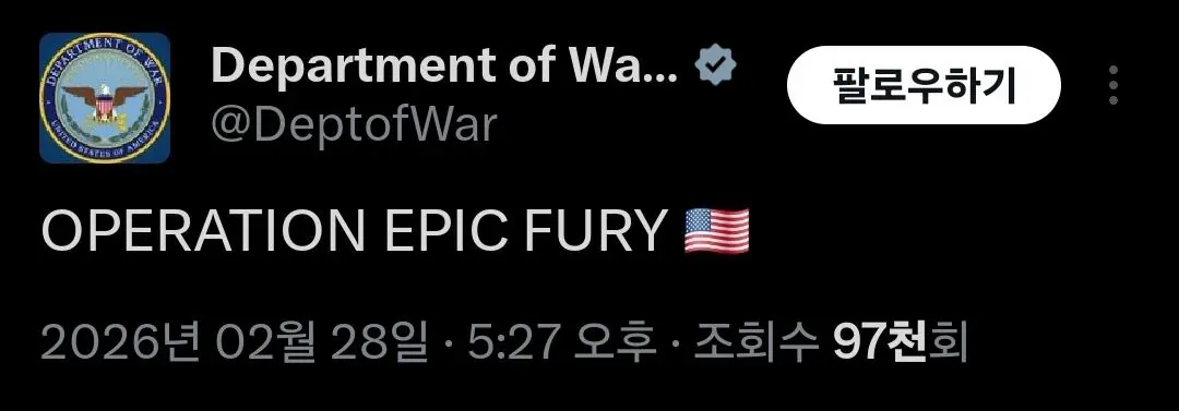 미국 전쟁부 “작전명 극대노” 1 3월 2026 • 1 min read • comment Subscribe to 호잇짜응의 시간 죽이기 Get the latest posts delivered right to your inbox Subscribe Great! Check your inbox and click the link to confirm your subscription. Please enter a valid email address!