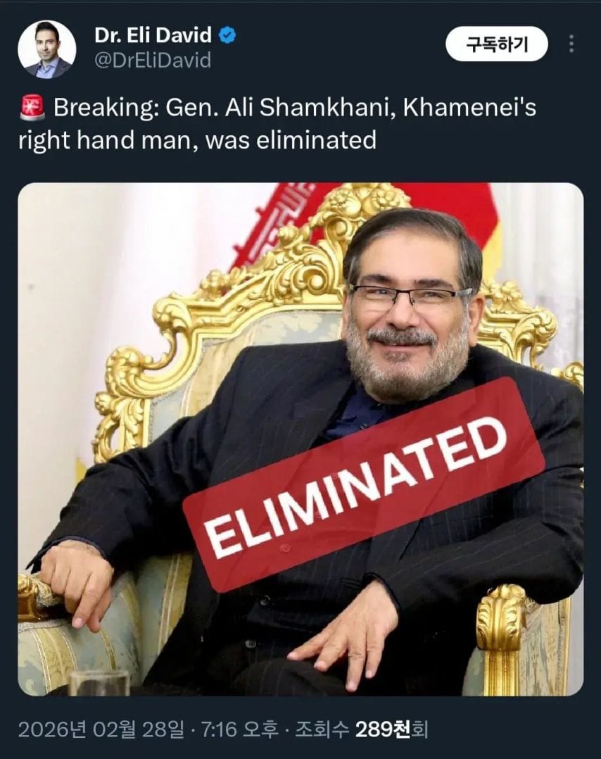 [속보] 이란 하메네이 오른팔 사망 1 3월 2026 • 1 min read • comment Subscribe to 호잇짜응의 시간 죽이기 Get the latest posts delivered right to your inbox Subscribe Great! Check your inbox and click the link to confirm your subscription. Please enter a valid email address!