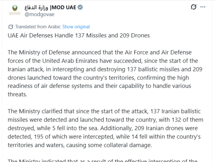 UAE 국방부, 137 미사일, 209 드론에 공격당함. 1 3월 2026 • 1 min read • comment Subscribe to 호잇짜응의 시간 죽이기 Get the latest posts delivered right to your inbox Subscribe Great! Check your inbox and click the link to confirm your subscription. Please enter a valid email address!